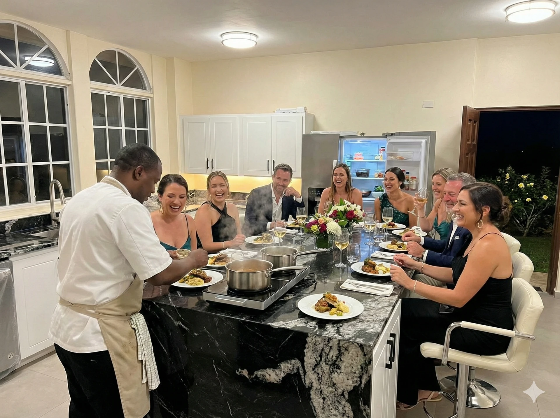 Choose your setting: ocean-view ceremony on the sky deck, cocktails by the infinity pool, reception on the wraparound terrace, or an intimate dinner in our gourmet kitchen.